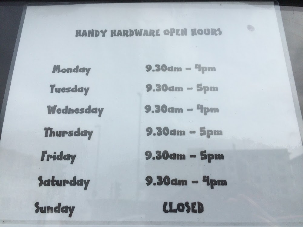 Here are Handy Hardware's opening hours, and please note that our hours may vary, so it's best to get in touch with us before planning your visit.